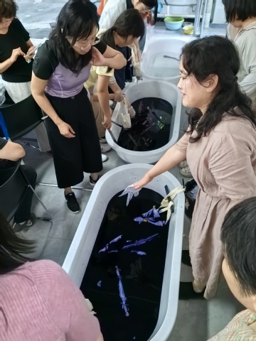 活动现场,李兆明老师通过示范讲解扎染的历史渊源与工艺技法,带领教职工从折叠、捆扎到染色,逐步完成个性化作品。参与者以空白帆布包为载体,通过不同手法创作出纹样独特的扎染成品,现场气氛热烈欢快。活动结束后,教职工纷纷展示自己的作品,并表示在实践互动中不仅领略了非遗文化的精妙,更感受到手工艺创作的乐趣。